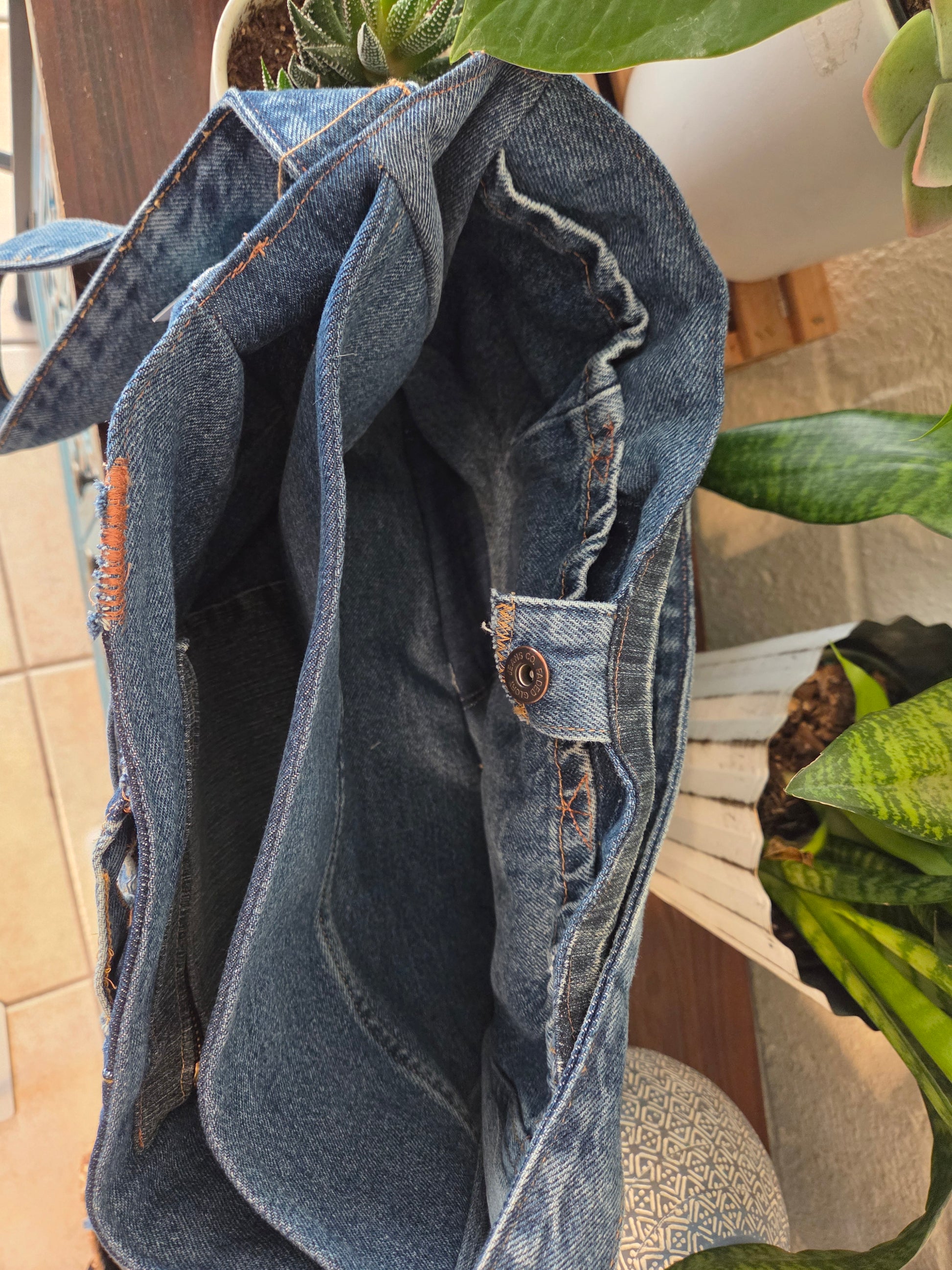 Hem computer bag with multiple interior pockets, crossbody, strap and button closure.