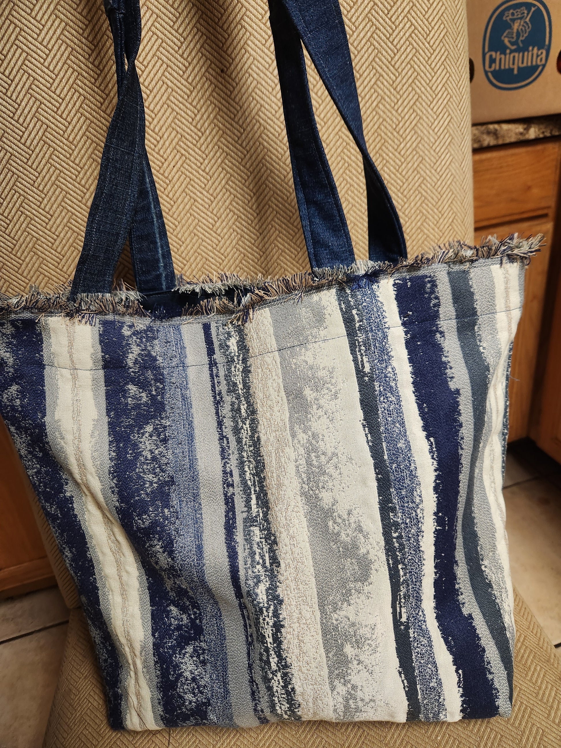 Upcycled upholstery fabric with jean straps 15"x18" (medium size)