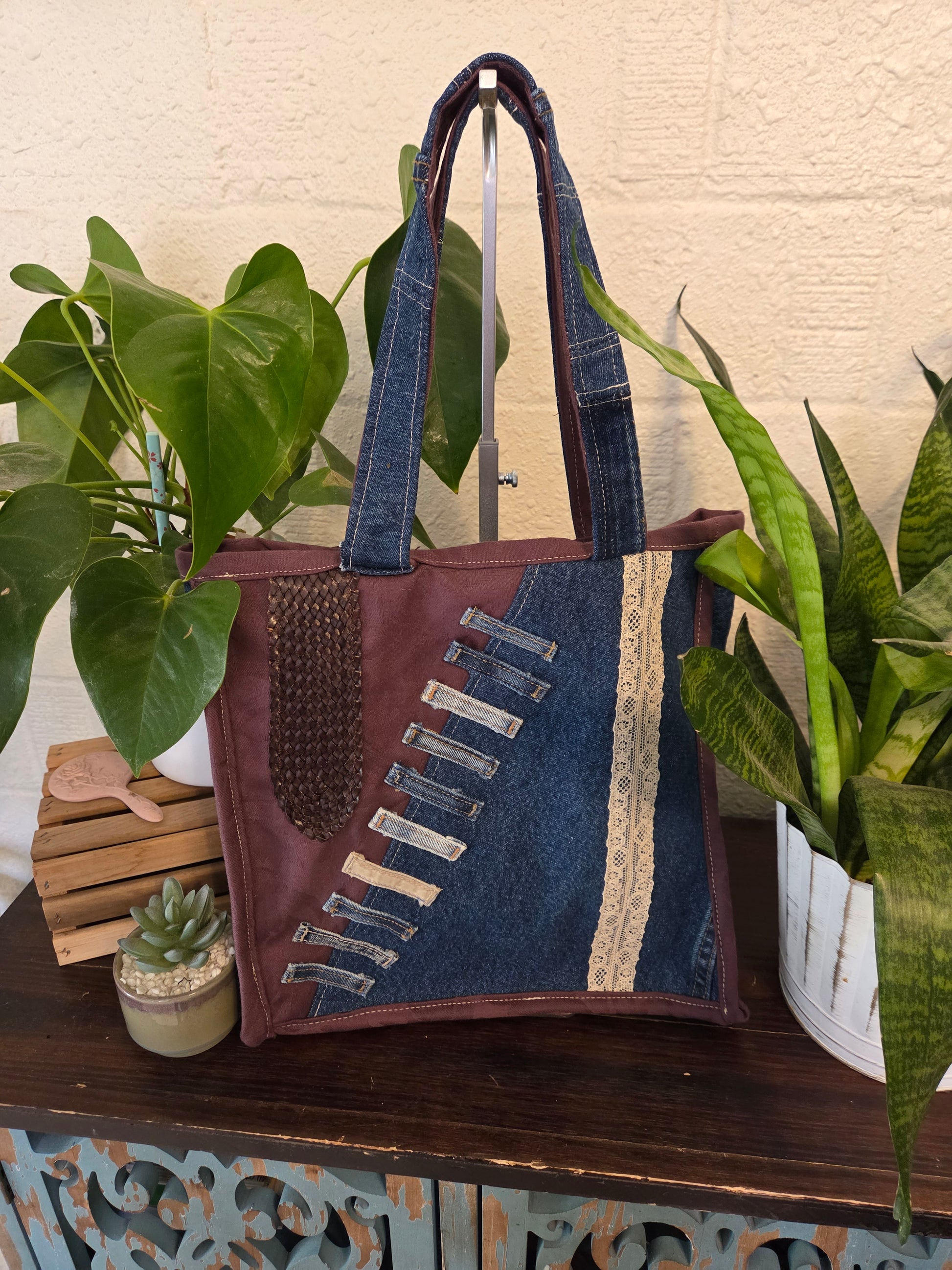 Unique 13 in by 15 in medium-sized tote bag with lace, belt loops and internal/external pockets.
